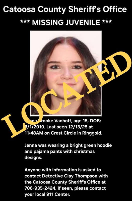 RINGGOLD, Ga. — Authorities in Catoosa County have confirmed that 15-year-old Jenna Brooke Vanhoff, who was reported missing on December 13, 2025, has been safely located.