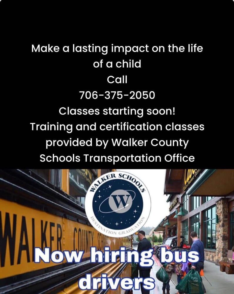 Walker County Schools is hiring school bus drivers.  Training and certification classes will be provided by the school system.  Call 706-375-2050.