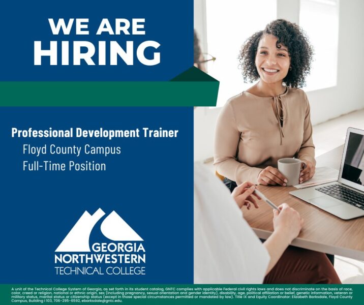 Georgia Northwestern Technical College (GNTC) is seeking qualified applicants for the position of a Professional Development Trainer to be located on the Floyd County Campus and will be required to regularly travel to other campuses to meet operational requirements. The ideal candidate is a creative and innovative professional with strong communication skills ready to engage employees in professional development. This position will be responsible for coordinating and facilitating all state-wide mandatory training, Technical College System of Georgia (TCSG) mandatory training, GNTC employee training, and facilitating new hire orientation.