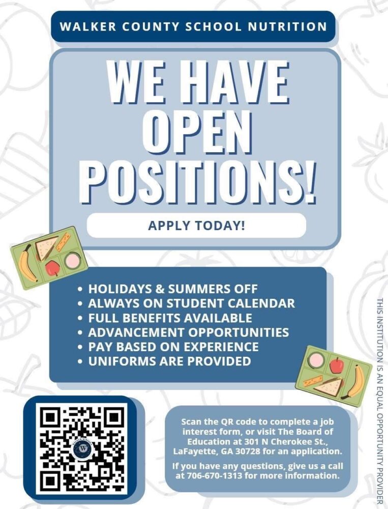 Walker County School Nutrition is now hiring and looking for dedicated individuals to join their team!