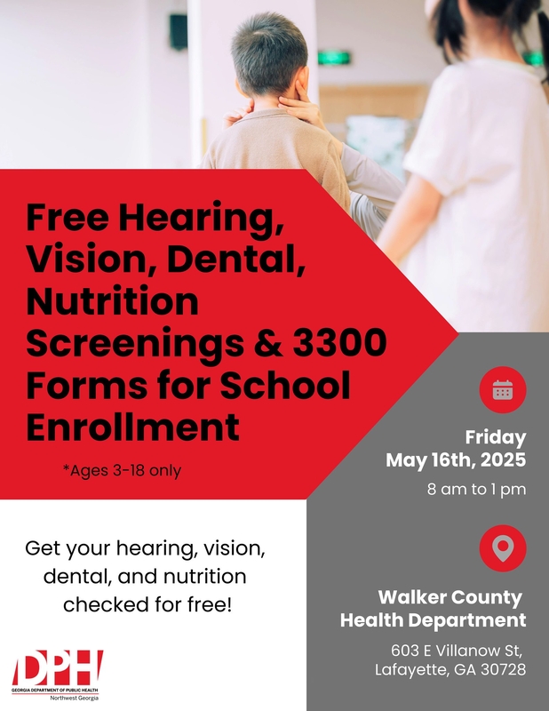 The Walker County Health Department will once again offer free health screenings on Friday, May 16, from 8:00 a.m. to 1:00 p.m.Services include hearing, vision, dental, and nutrition checks, along with 3300 Forms required for school enrollment.No appointment is necessary—just stop by at 603... Read More.