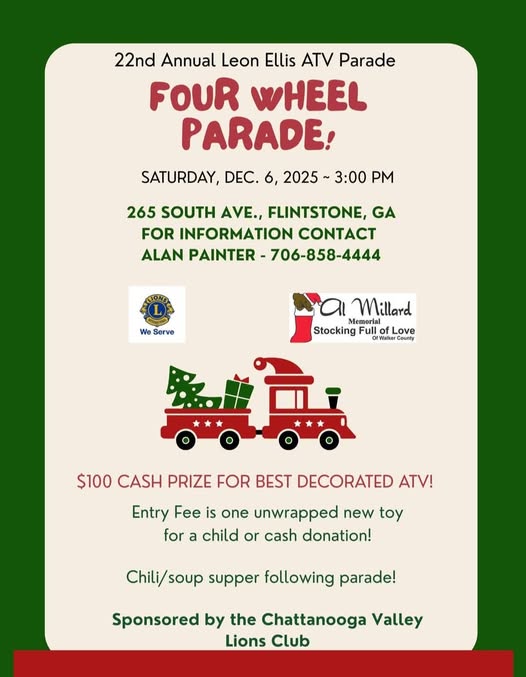 The Chattanooga Valley Lions Club invites the community to join them for the 22nd Annual Leon Ellis ATV “Four Wheel Parade” on Saturday, Dec. 6, 2025, at 3 p.m. The festive ride will begin at 265 South Ave. in Flintstone, GA.