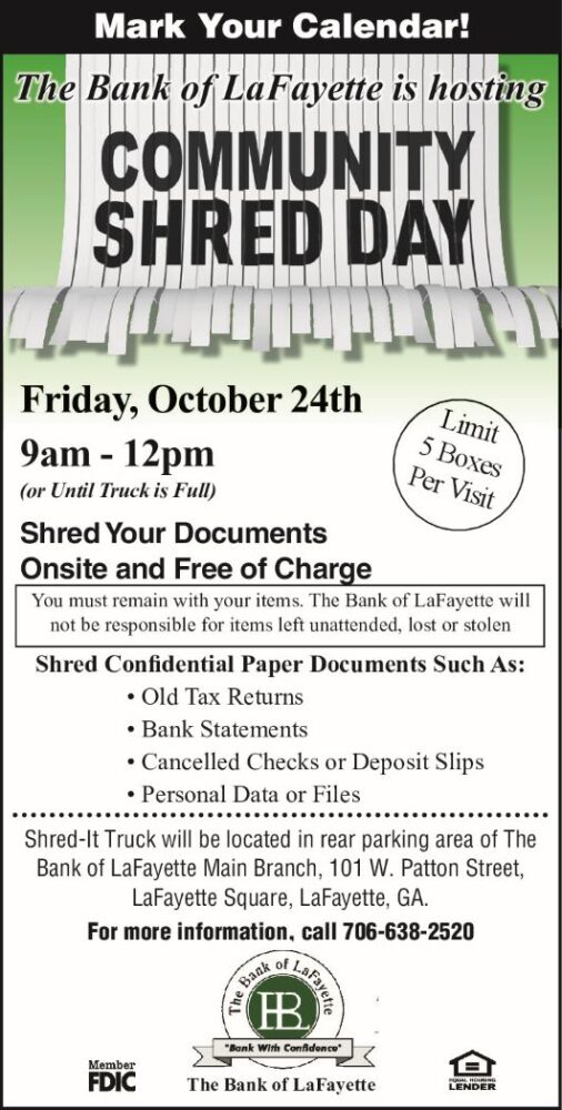 Shred-It Truck will be located in rear parking area of The Bank of LaFayette Main Branch, 101 W. Patton Street, LaFayette Square, LaFayette, GA.
