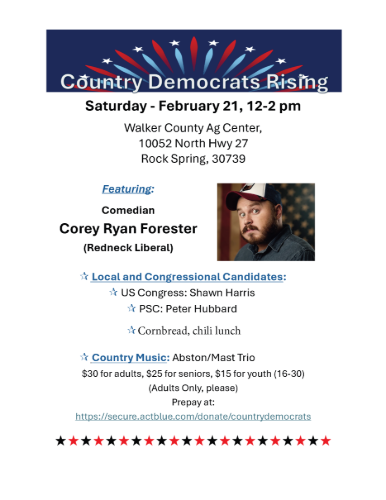 The public is invited to a multi-county Democratic rally hosted by the Walker, Dade, Catoosa, and Chattooga County Democratic Parties!