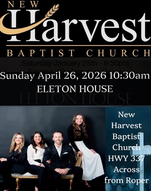 Make plans now to join New Harvest Baptist Church, located across the street from Roper, on Sunday, April 26th at 10:30 a.m. for a special singing with Eleton House. Channing Eleton, former pianist for Poet Voices and Gold City, will be singing alongside his daughters in this powerful gospel group.