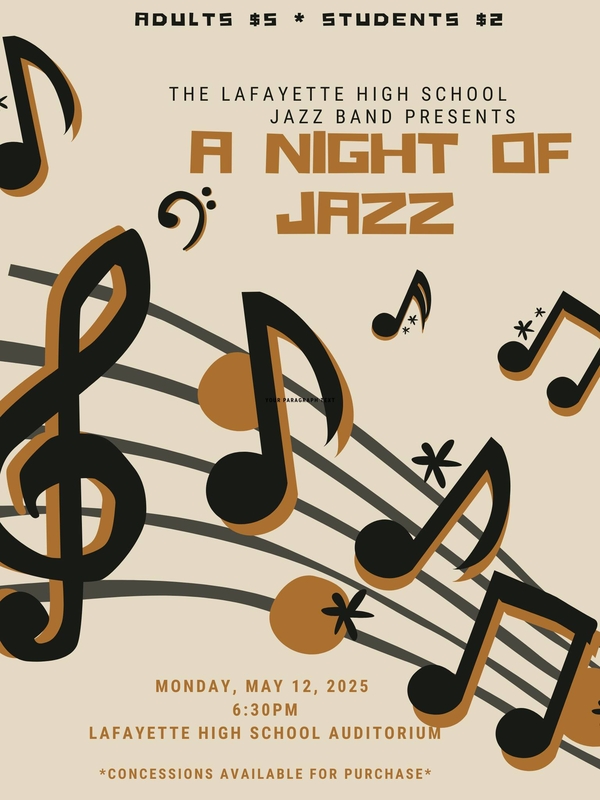 The LHS Jazz Band is thrilled to invite you to A Night of Jazz!—an evening filled with smooth rhythms, soulful solos, and unforgettable performances. On Monday, May 12th at 6:30 PM. join the lively celebration of music and talent. Tickets are just $5 for adults and $2 for students, making it an affordable night out for the whole family. Enjoy delicious concessions available for purchase while you soak in the sounds of the talented musicians.