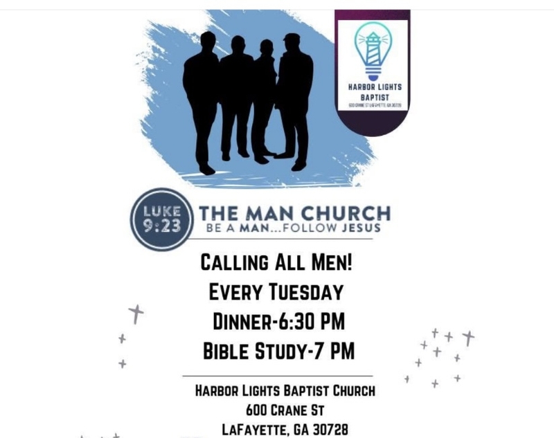 Men are invited to Man Church at Harbor Lights Baptist Church 600 Crane St. LaFayette EVERY Tuesday Night. Led by Rick Burgess by internet and Pastor Jim Powell. Eat and Fellowship at 6:30, Man Church starts at 7. You will be glad you came.