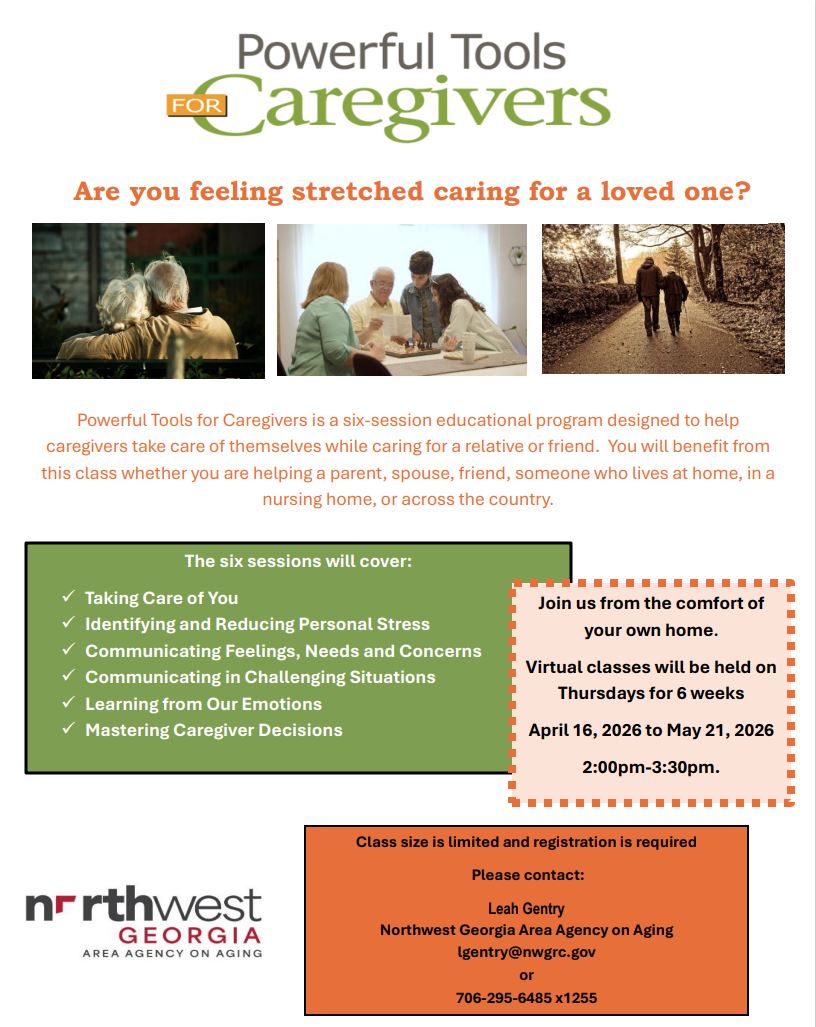 Caregivers who are feeling stretched while caring for a loved one are invited to participate in an upcoming Powerful Tools for Caregivers virtual class series hosted by the Northwest Georgia Area Agency on Aging.