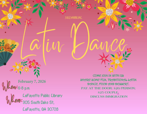 The Progressive Youth Council, mentored by Walker Democrats’ Outreach, will host its Third Annual Latino Dance Night on February 24 from 6–8 p.m. at the La Fayette Library, located at 305 South Duke Street, La Fayette, GA 30728.