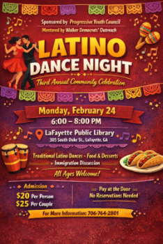 The Progressive Youth Council, mentored by Walker Democrats’ Outreach, will sponsor its Third Annual Latino Dance Night on Tuesday, February 24, from 6:00 to 8:00 p.m. at the LaFayette Public Library, located at 305 South Duke Street, LaFayette, GA 30728.
