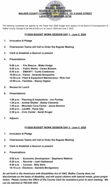 The Walker County Board of Commissioners will hold a budget work session on June 2 and June 3 beginning at 9:00 a.m. both days. The work sessions will take place at 101 S Duke Street in LaFayette and will be streamed live on the county’s Facebook page.