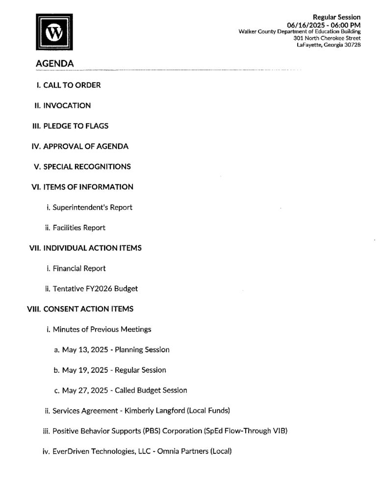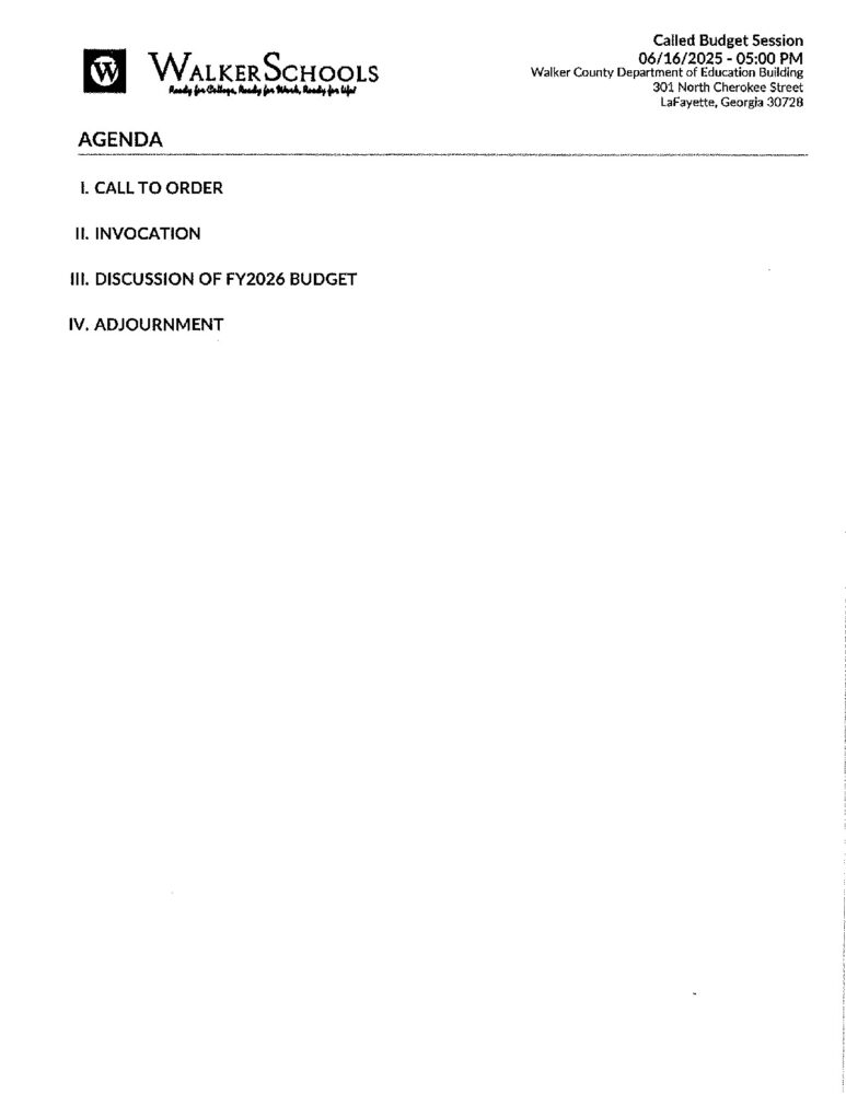 AGENDA: Walker County School Board & Called Budge Session Monday 6/16