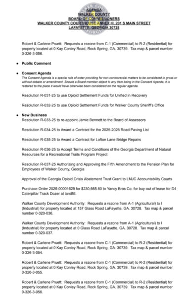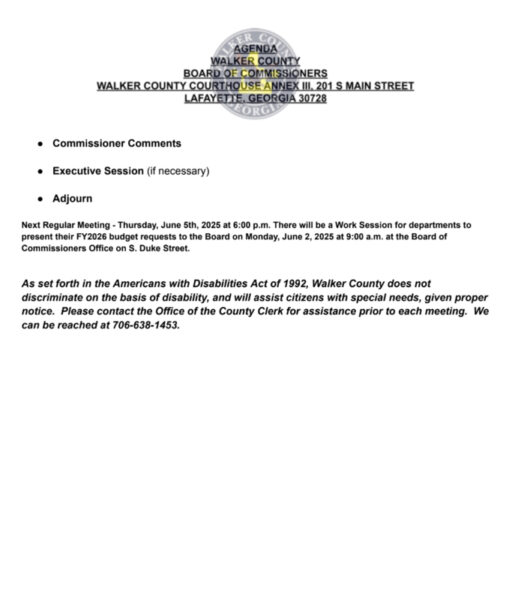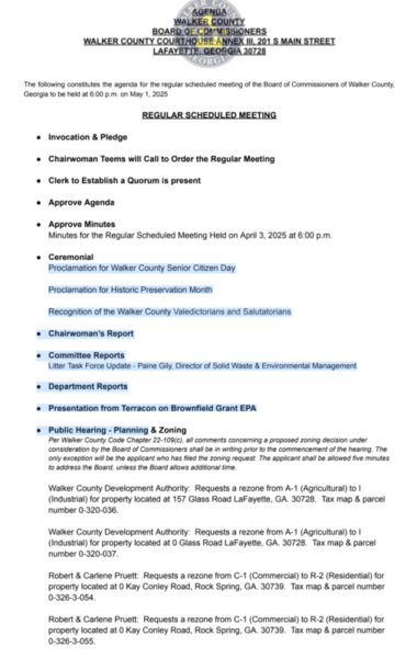 HomeGovernment MeetingsWalker County Board of Commissioners Meeting and AgendaWalker County Board of Commissioners Meeting and AgendaFri, April 25, 2025SHARE NOW The Walker County Board of Commissioners meeting is May 1, 2025 at 6:00 p.m. at Courthouse Annex III at 201 S Main Street in LaFayette. See the agenda to follow.