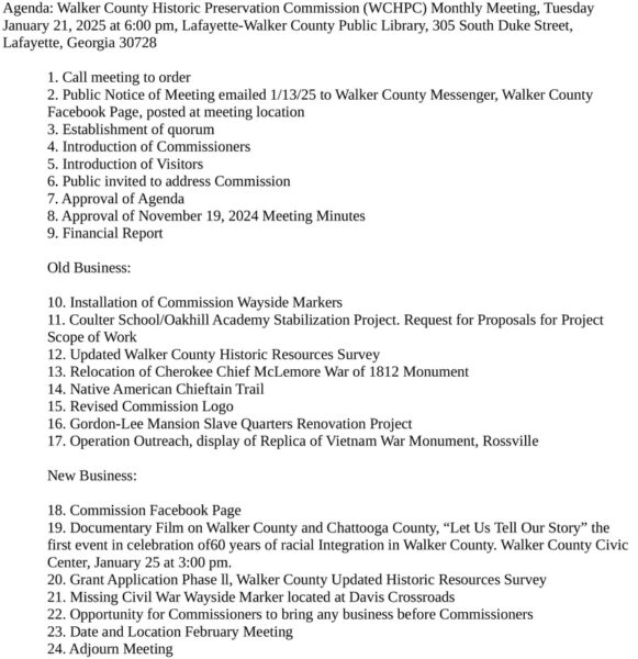 The Walker County Historic Preservation Commission meets Tuesday, January 21 at 6:00 p.m. at the LaFayette-Walker County Public Library, 305 South Duke Street in LaFayette. The public is invited to attend.