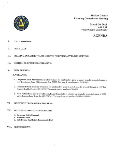 This is the agenda for the next Walker County Planning Commission meeting. The Planning Commission meets at 6:00 p.m. on Thursday, March 20, at the Walker County Civic Center, 10052 Hwy 27 in Rock Spring. A complete agenda packet is available Online here.