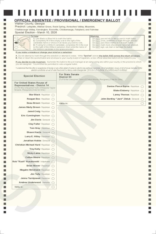 According to the ballot, the special election will take place March 10, 2026, and includes contests for U.S. House of Representatives District 14 and Georgia State Senate District 53. The ballot shown is labeled an Official Absentee / Provisional / Emergency Ballot and includes instructions for properly marking and returning votes.