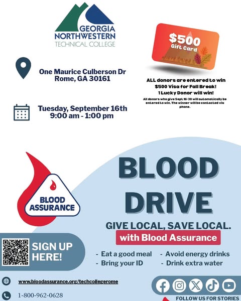 Georgia Northwestern Technical College (GNTC) students will have the chance to make a life-saving difference while earning rewards this month, as Blood Assurance hosts blood drives at two campus locations.