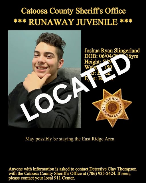 The Catoosa County Sheriff’s Office is reporting that 16-year-old Joshua Ryan Slingerland, who was reported missing earlier this week, has been located. Joshua, a white male, was last seen in Catoosa County in the early hours of January 31, 2026, and authorities had indicated he might be in the East Ridge, Tennessee area.