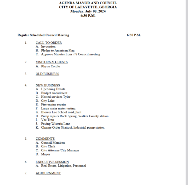 City Of LaFayette Regularly Scheduled Council Meeting Monday August 12 at 6:30 PM.