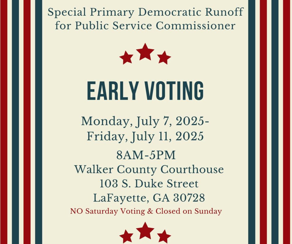 Early voting begins Monday, July 7, for the Democratic Special Primary Run-Off Election for Georgia’s Public Service Commission. Walker County voters will have the opportunity to cast ballots through Friday, July 11, from 8:00 a.m. to 5:00 p.m. at the Elections and Registration Office inside the Walker County Courthouse.