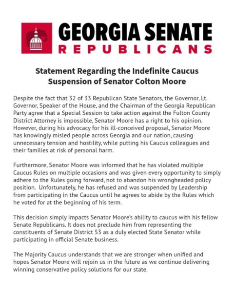 “Senator Moore has a right to his opinion. However, during his advocacy for his ill-conceived proposal, Senator Moore has knowingly misled people across Georgia and our nation, causing unnecessary tension and hostility, while putting his Caucus colleagues and their families at risk of personal harm,” the letter stated.