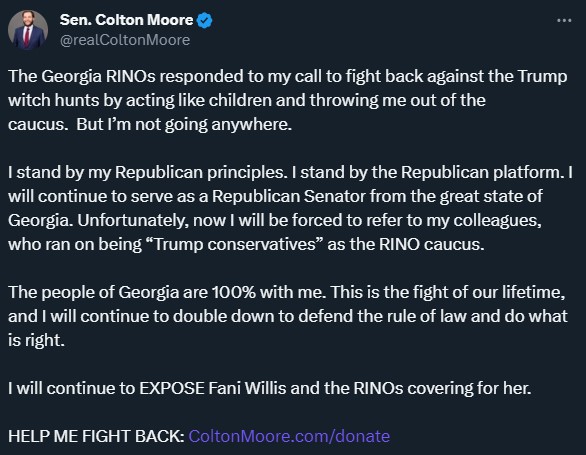 “The Georgia RINOs responded to my call to fight back against the Trump witch hunts by acting like children and throwing me out of the caucus. But I’m not going anywhere,” Senator Moore stated in a social media post.