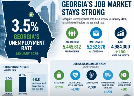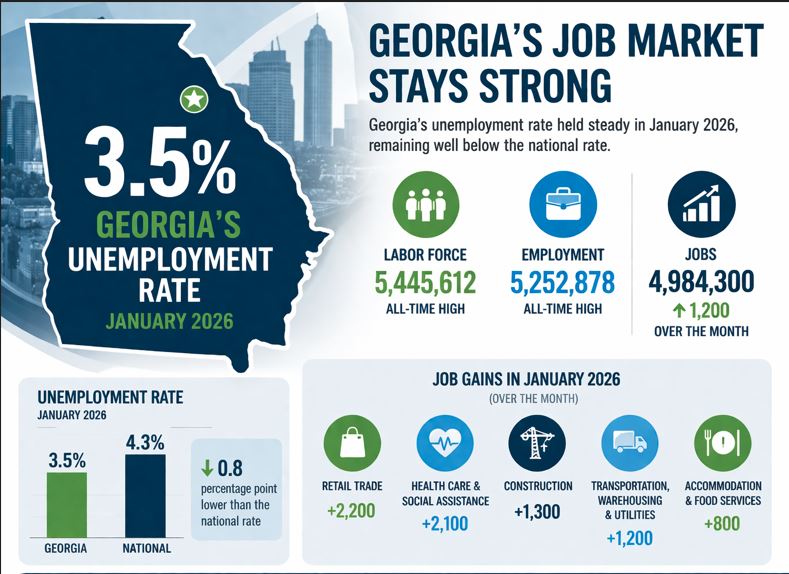 The Georgia Department of Labor announced that Georgia’s unemployment rate for January 2026 held steady at 3.5 percent, unchanged from a revised 3.5 percent in December and below the national unemployment rate by 0.8 percentage point. The state’s unemployment rate was 3.4 percent one year ago.