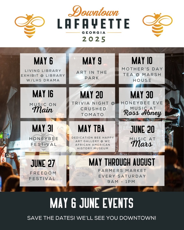LaFayette, GA – The City of LaFayette is buzzing with excitement as a full slate of May events leads up to the highly anticipated Honeybee Festival in downtown.