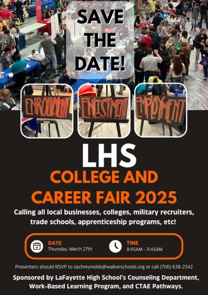 LaFayette High School is looking for presenters for their College and Career Fair 2025 on March 27th, from 8:45 am- 11:45 am. They need local businesses, colleges, military recruiters, trade schools, apprenticeship programs and more to get involved as presenters. Contact Zach Reynolds via email at : [email protected] or call: 706-638-2342 .