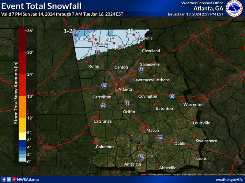 The National Weather Service in Peachtree City has issued a Winter Storm Watch for Monday until Tuesday Morning. Heavy snow is reported to be possible. Total snow accumulations of up to two inches and ice accumulations of a light glaze are possible in Dade, Walker and Catoosa Counties.