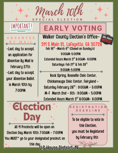 Early voting for the special election will begin on February 16 and will be held at the Walker County Elections Office. Early voting hours will run from 9:00 a.m. to 5:00 p.m.