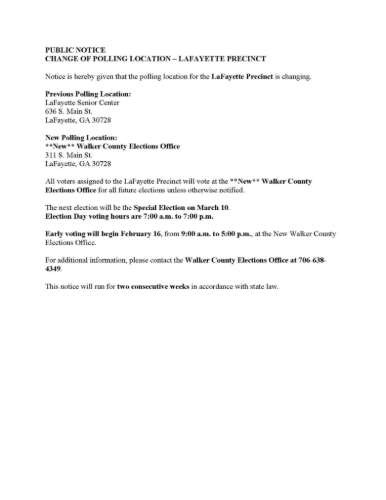 The polling location has been moved from the LaFayette Senior Center, located at 636 S. Main Street, to the Walker County Elections Office at 311 S. Main Street in LaFayette. All voters assigned to the LaFayette Precinct will cast their ballots at the new location for all future elections unless otherwise notified.