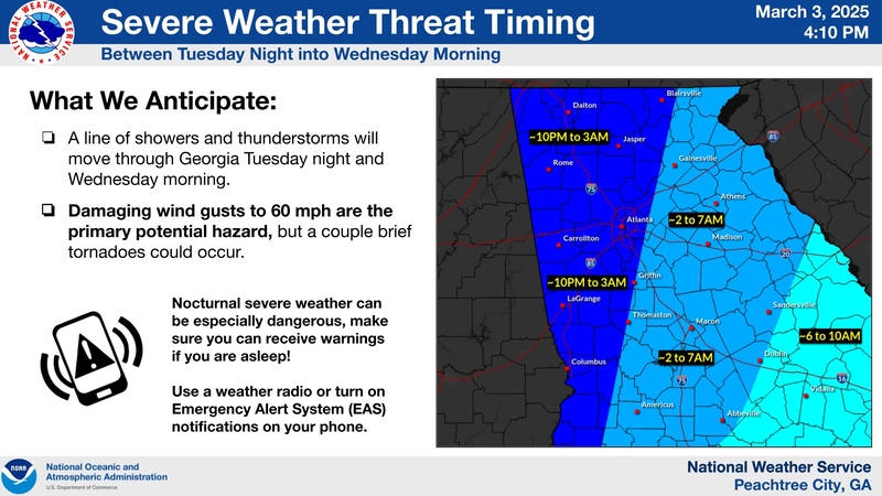 Thunderstorms will head into Georgia Sometime overnight from Tuesday to Wednesday. These storms will have gusty high winds with the potential of knocking down trees and blowing around unsecured objects.