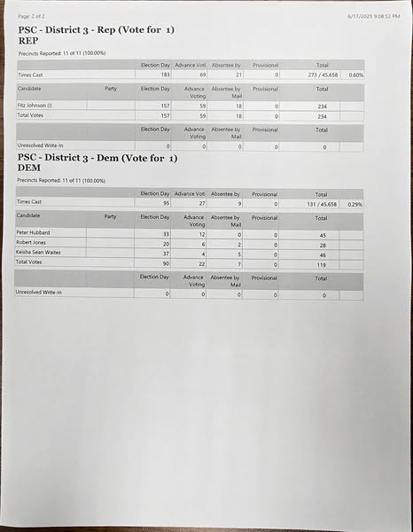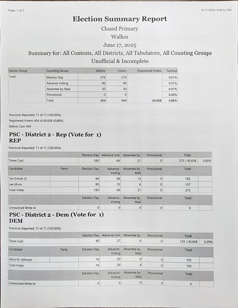 LaFayette, GA – March 19, 2025 –Walker County Certifies Results of Public Service Commissioner Special Primary Election.  404 ballots were cast in Walker County in yesterday’s election.  The local results are below.  Walker County voters agreed with the rest of the state in the election outcomes.  In the District 2 Republican Primary incumbent Tim Echols defeated Lee Muns with more than 76% of the vote.  Echols will now face Democrat Alicia M. Johnson in November’s General Election.  Johnson ran unopposed on the Democratic ticket.  In District 3, Republican Fritz Johnson was unopposed while Keisha Sean Waites won the Democratic nod with more than 46% of the vote statewide.