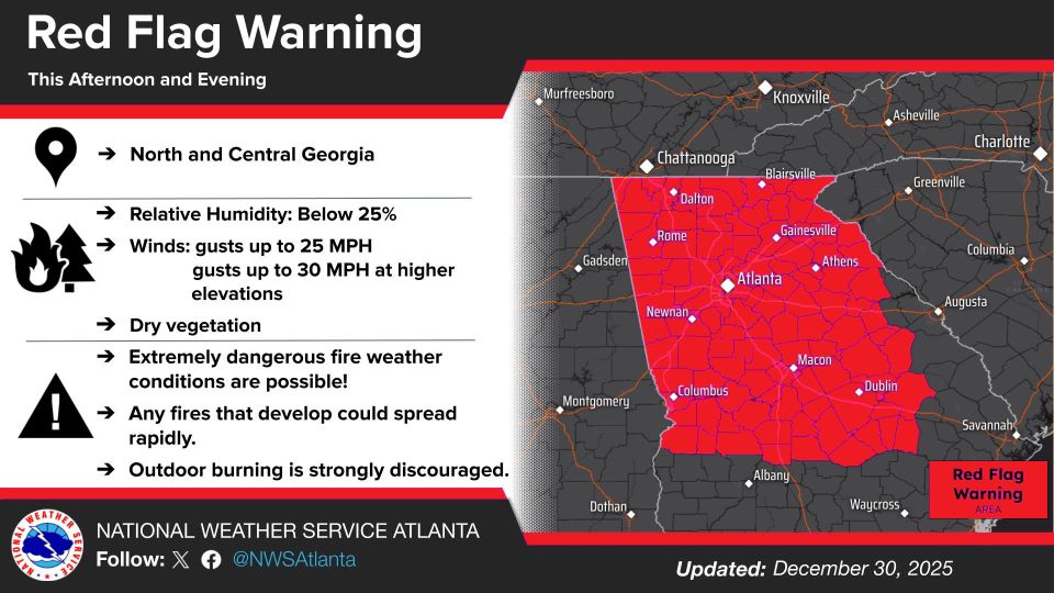 A Red Flag Warning will be in effect for Walker County and other parts of Georgia today from noon until 7 p.m., as weather conditions create a heightened risk for wildfires.