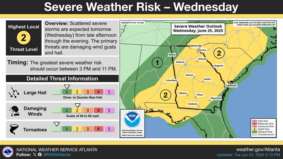 June 24, 2025 — Forecasters are growing increasingly confident that scattered severe thunderstorms will develop across the region on Wednesday afternoon and evening, bringing the potential for hazardous weather conditions.