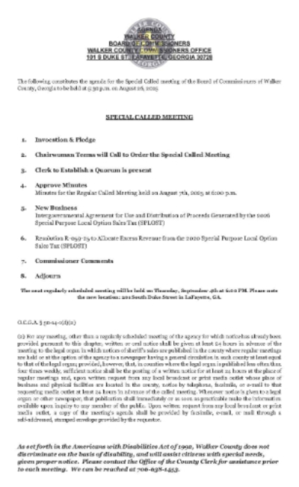 The special called meeting will begin at 5:30 p.m. on Tuesday, August 26, at the Walker County Commissioners Office, located at 101 South Duke Street in LaFayette.