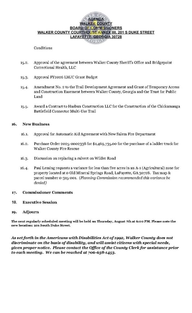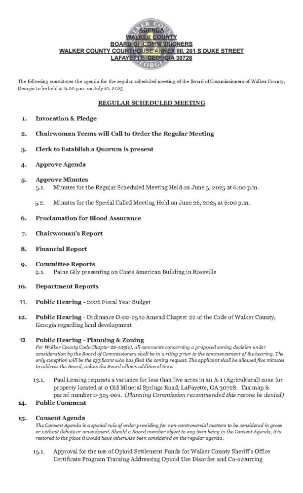 LaFayette, GA — The Walker County Board of Commissioners will hold its next regular meeting on Thursday, July 10, 2025, at 6:00 p.m. at Courthouse Annex IV, located at 201 S Duke Street in LaFayette.