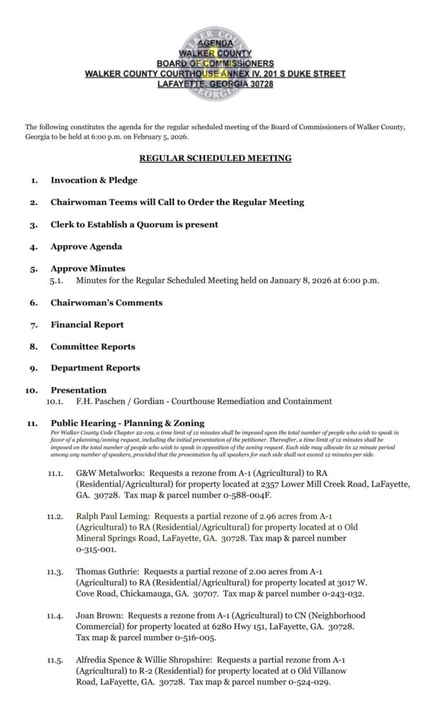 The Walker County Board of Commissioners will hold its regular scheduled meeting Thursday, February 5, at 6 p.m. at Courthouse Annex IV, located at 201 S. Duke Street in LaFayette. The meeting will also be streamed live on the county’s Facebook page and YouTube channel.