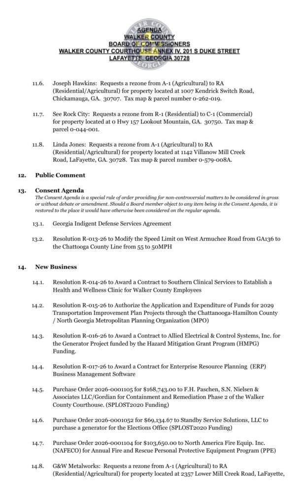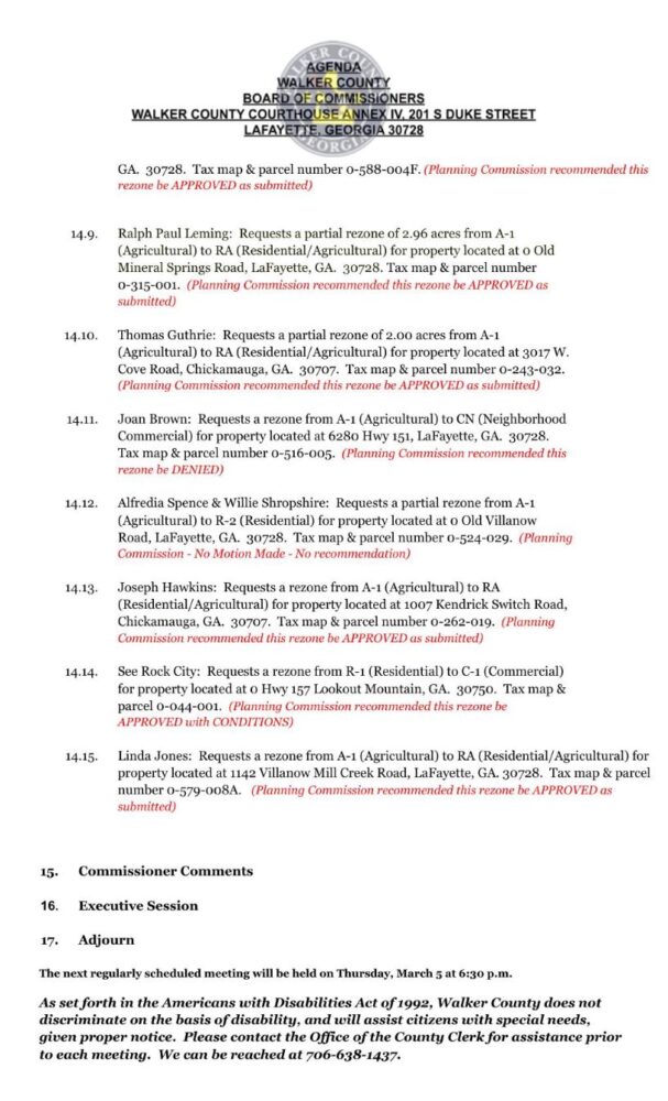 Eight rezoning requests are scheduled for the public hearing, including proposals from G&W Metalworks, Ralph Paul Leming, Thomas Guthrie, Joan Brown, Alfredia Spence and Willie Shropshire, Joseph Hawkins, See Rock City, and Linda Jones, involving properties in LaFayette, Chickamauga and Lookout Mountain.