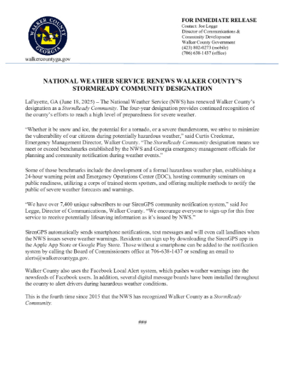 LaFayette, GA (June 18, 2025) – The National Weather Service (NWS) has officially renewed Walker County’s designation as a StormReady Community, marking the fourth time the county has received the recognition since 2015. The renewed status will remain in effect for four years and highlights the county’s continued commitment to severe weather preparedness and public safety.