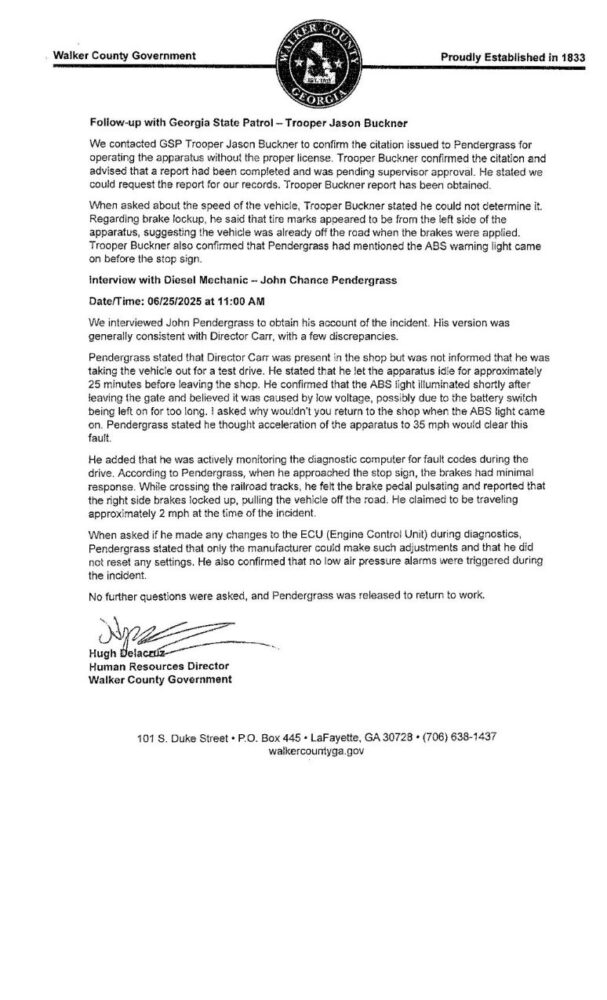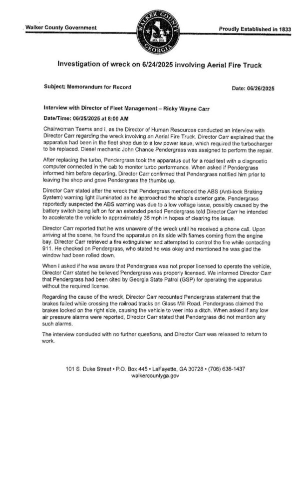 Walker County Chairwoman Angie Teems also consulted an experienced diesel mechanic who had previously worked on county fire trucks. The mechanic told her that in over 40 years of work, he had never seen a brake failure behave as described and stated the vehicle’s reaction did not match the typical behavior during brake failure.