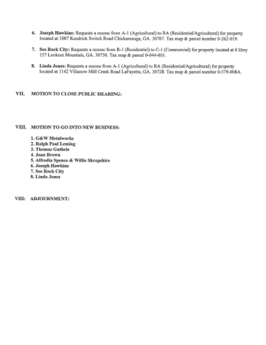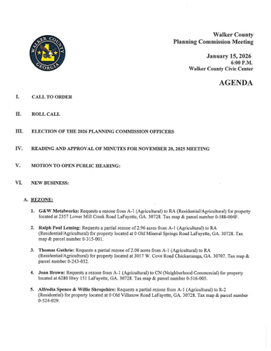 The Walker County Planning Commission will hold its next meeting at 6:00 p.m. on Thursday, January 15, at the Walker County Civic Center, 10052 Hwy 27 in Rock Spring.