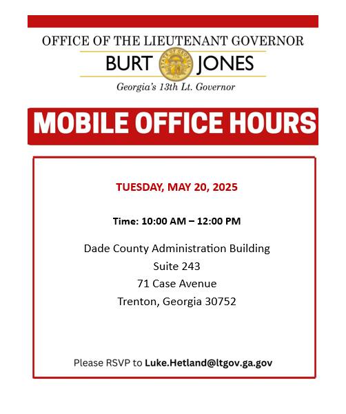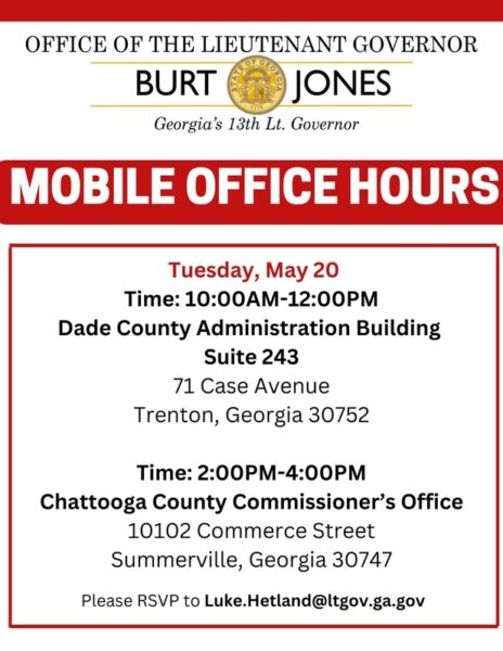 Walker County, GA — Walker County residents are encouraged to attend upcoming mobile office hours hosted by Lt. Governor Burt Jones’ staff on Tuesday, May 20. While no session will be held directly in Walker County, constituents can meet with North Georgia Field Director Luke Hetland at two nearby locations.